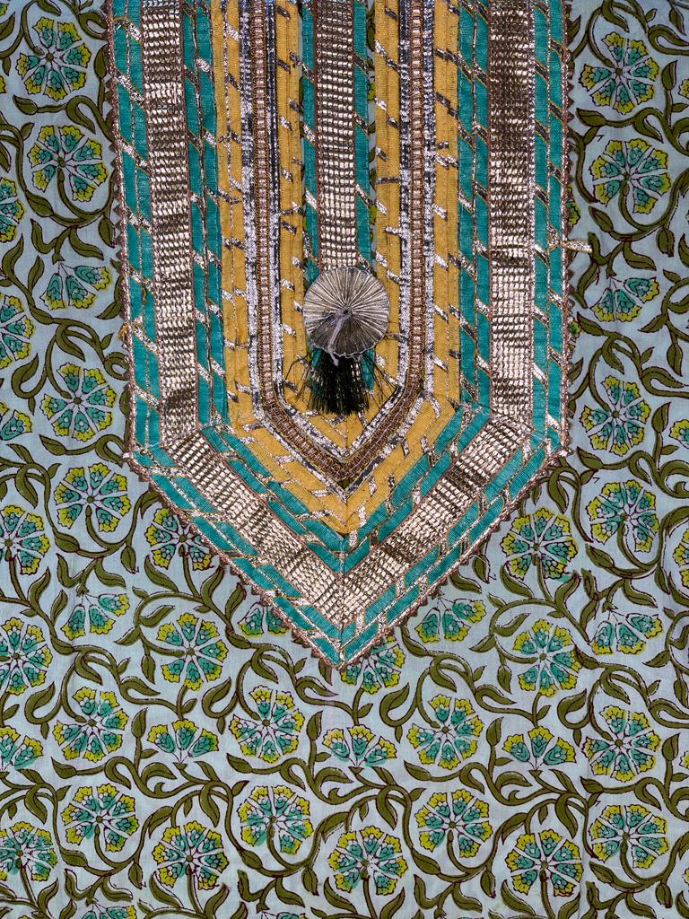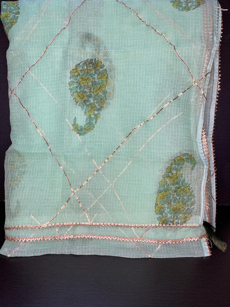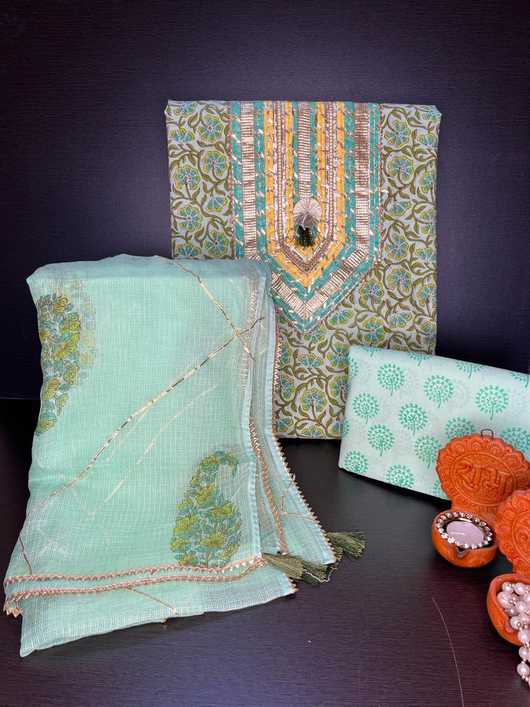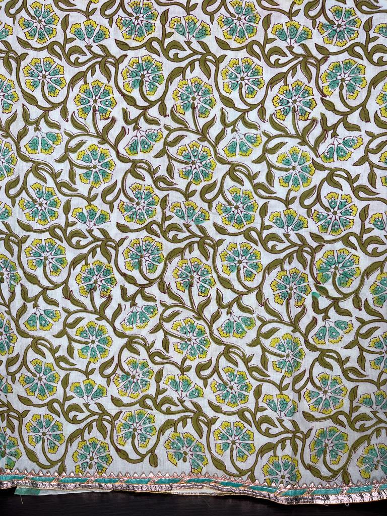 Premium quality hand block cotton unstitched dress material for all your casual and small party needs. Make your dress beautiful with this Gota Lace work dupatta.
