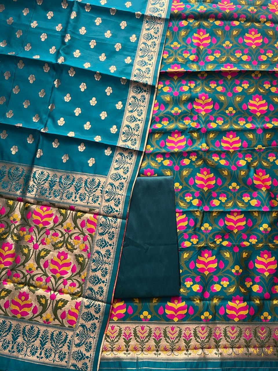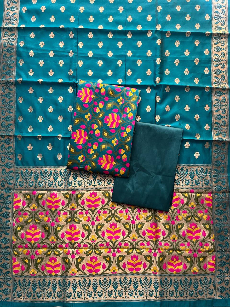 Experience the luxurious feel of our Banarasi cotton silk jamdani unstitched suit material. Made with expert craftsmanship and intricate weaving, this suit material offers a high-quality and elegant finish. Perfect for special occasions, this material is sure to elevate your wardrobe with its timeless beauty.