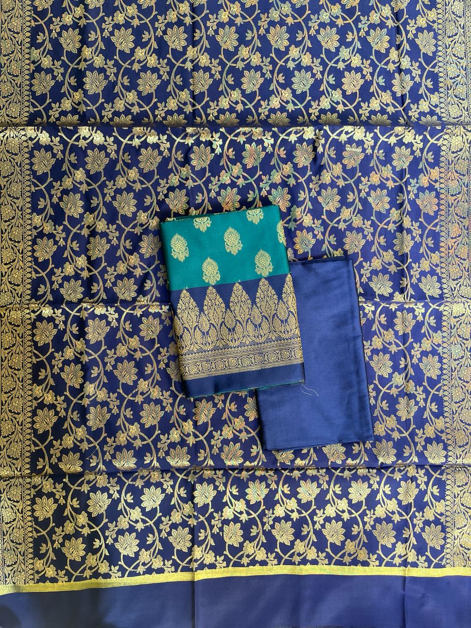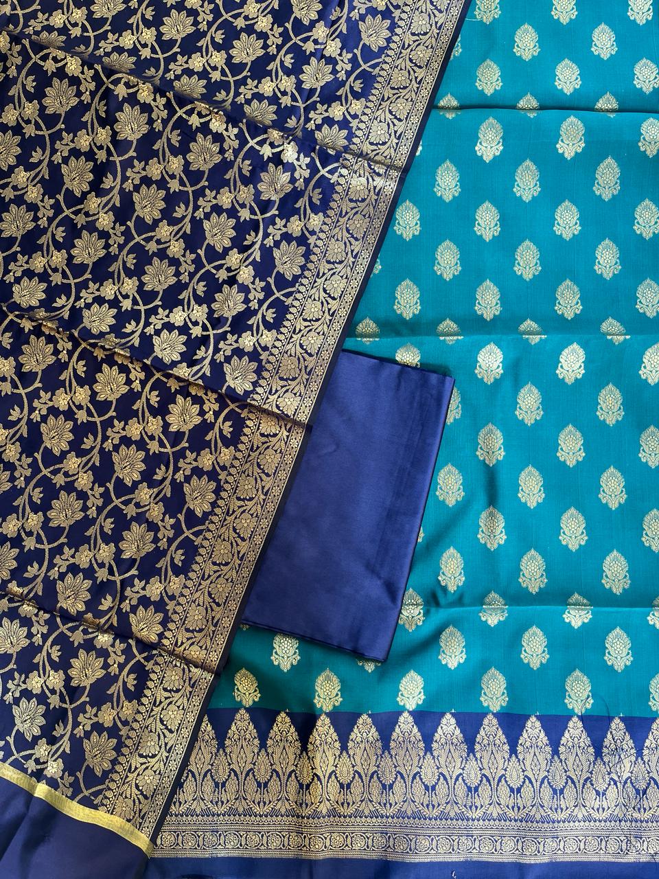 Experience the luxurious feel of our Banarasi katan silk zari weaving unstitched suit material. Made with expert craftsmanship and intricate weaving, this suit material offers a high-quality and elegant finish. Perfect for special occasions, this material is sure to elevate your wardrobe with its timeless beauty.