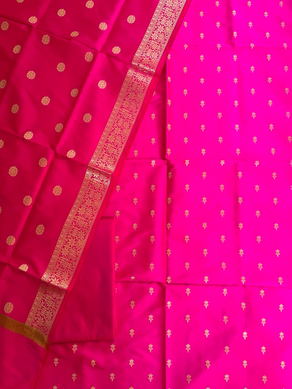 Experience the luxurious feel of our Banarasi katan silk zari weaving unstitched suit material. Made with expert craftsmanship and intricate weaving, this suit material offers a high-quality and elegant finish. Perfect for special occasions, this material is sure to elevate your wardrobe with its timeless beauty.