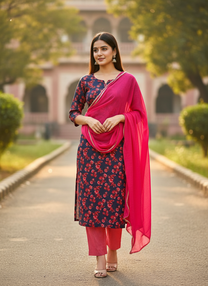 Premium quality cotton unstitched dress material for all your formal & casual needs. Make your dress beautiful with this chiffon dupatta.