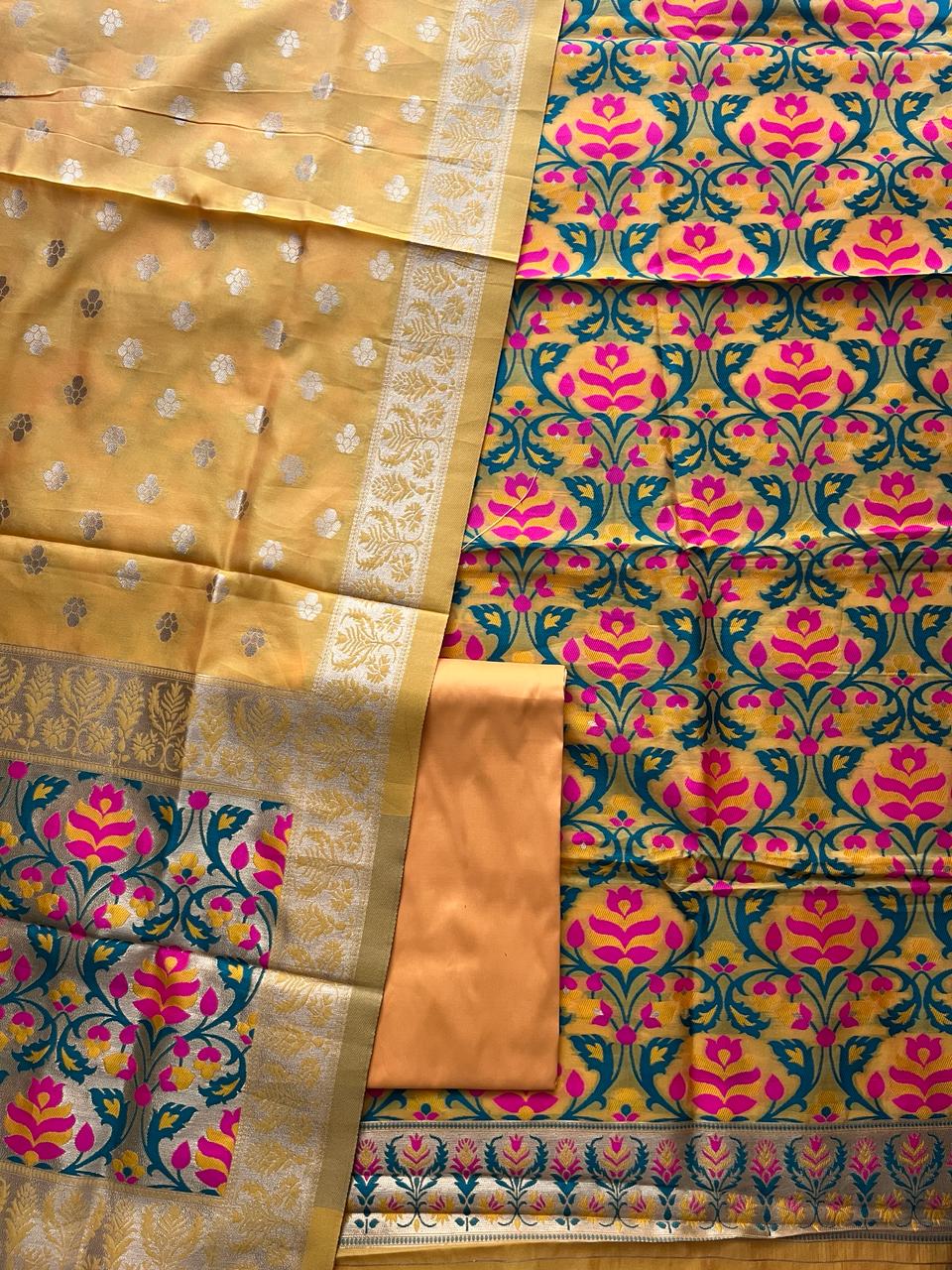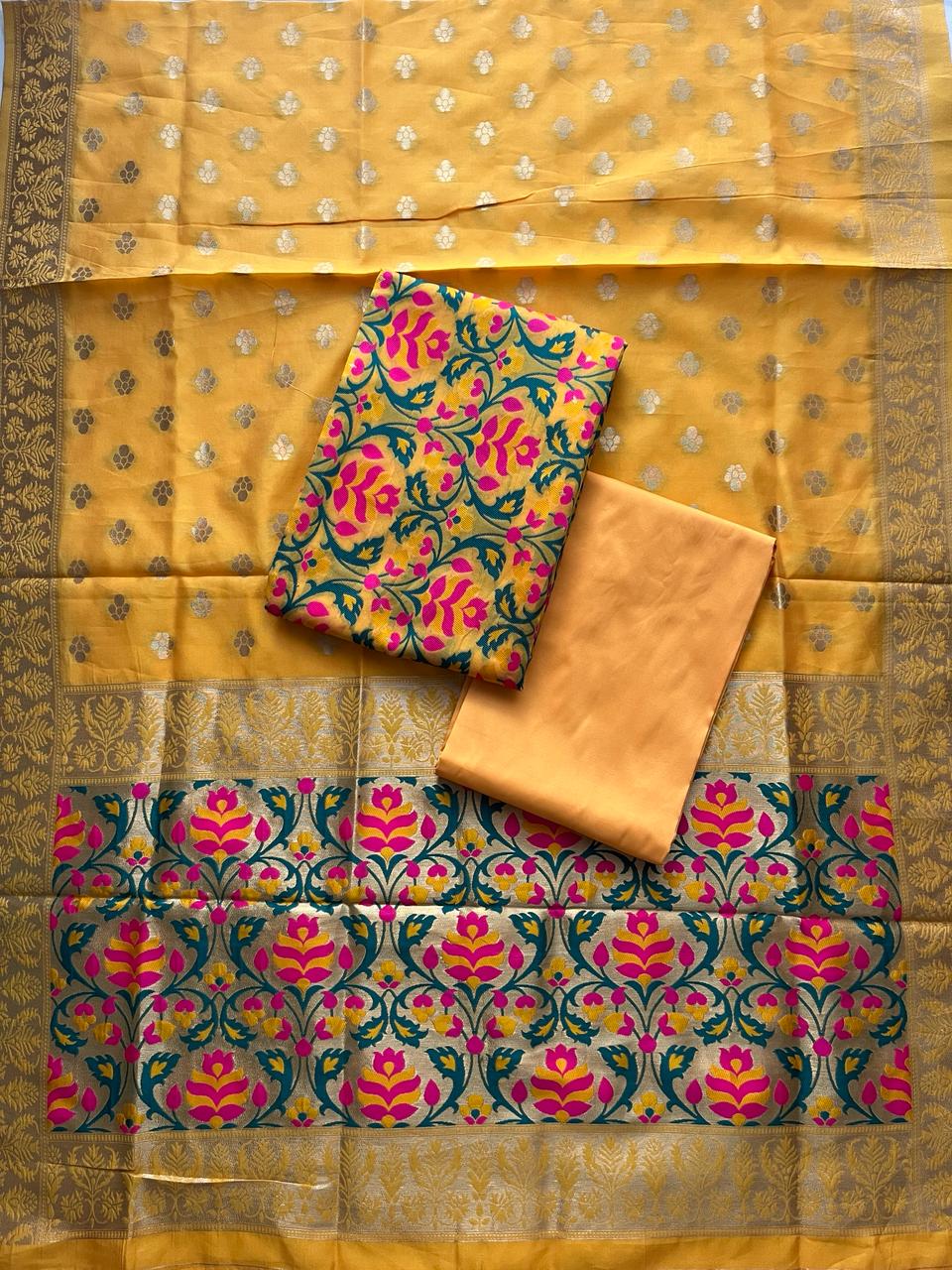 Experience the luxurious feel of our Banarasi cotton silk jamdani unstitched suit material. Made with expert craftsmanship and intricate weaving, this suit material offers a high-quality and elegant finish. Perfect for special occasions, this material is sure to elevate your wardrobe with its timeless beauty.
